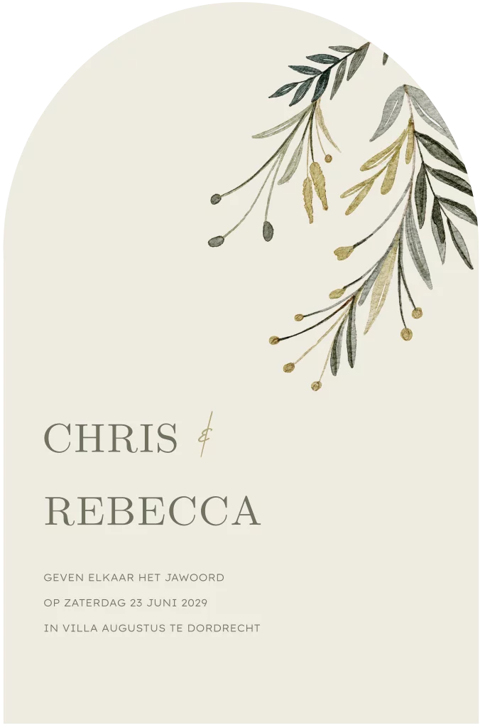 Nodig je vrienden en familie uit op jullie bruiloft met deze prachtige trouwkaart in een boogvorm. Bovenaan staan waterverf takjes in groene tinten. De originele vorm maakt deze uitnodiging extra origineel.
