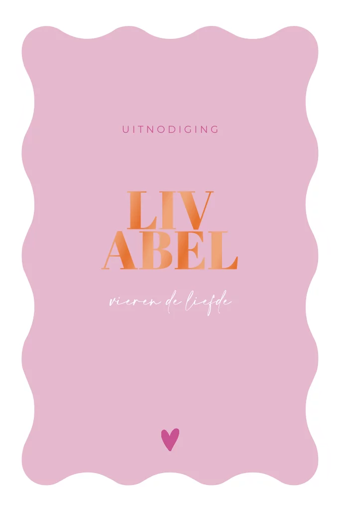 Prachtige hippe trouwkaart met een golf rand. De achtergrond is roze met daarop oranje letters in hoogglans. De buitenste rand is wit. Je kunt alle kleuren aanpassen in onze editor.