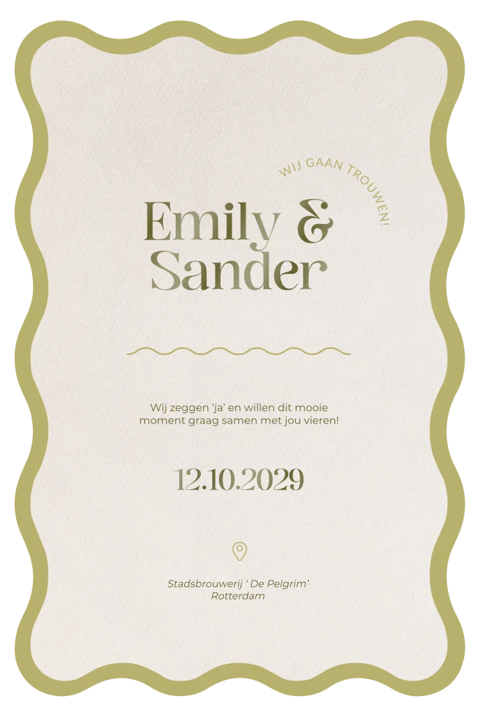 Zoek je een originele trouwkaart, dan is dit er eentje. Een uitnodiging met een beige achtergrond en een groene rand. Daarop staan de namen en trouwdatum gedrukt in een hoogglans groene kleur. De halfronde tekst met Wij gaan trouwen en het golfje geeft de kaart iets extra's. Bewerk deze bruiloft kaart in onze editor en je kunt de kleuren zelf aanpassen naar wens.