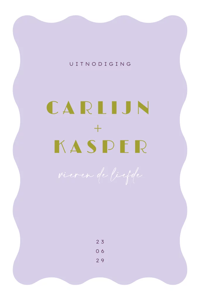 Prachtige trouwkaart met een golvende rand. De buitenste rand is wit en de achtergrond is lila. Op de kaart staan de namen in een felgroene kleur. Je kunt de achtergrondkleur zelf aanpassen.