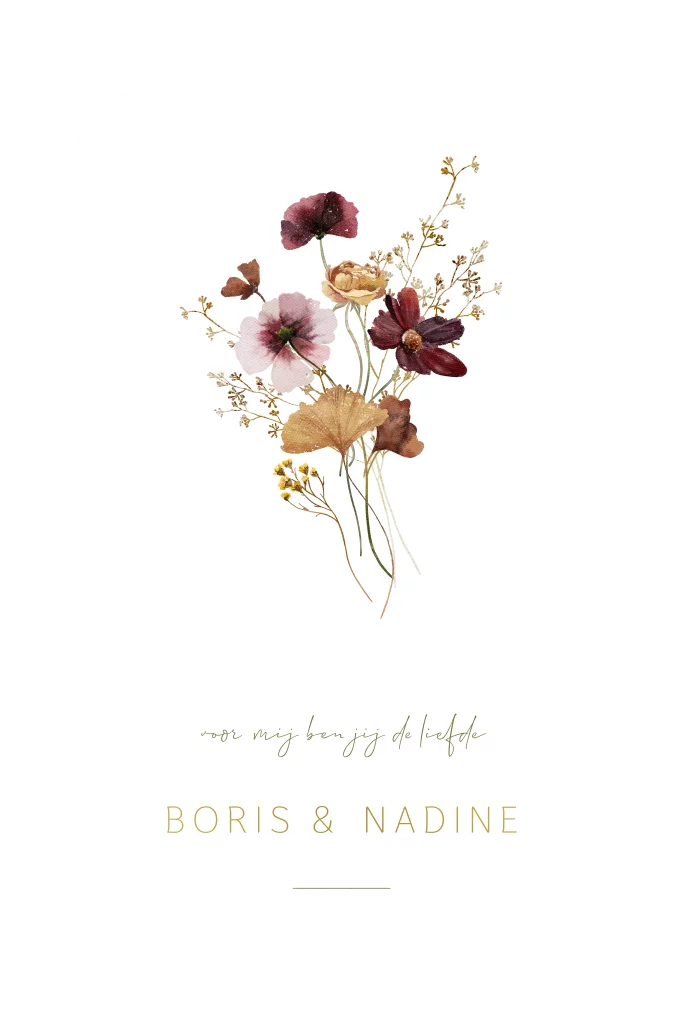 Op zoek naar een klassieke trouwkaart met mooie illustraties? Ontdek onze prachtige trouwkaart illustratie bloemen in boogvorm in paars en oranje, afgewerkt met schitterend goudfolie. De boogvormige kaart heeft een tijdloos witte achtergrond en wordt verfraaid met een betoverende illustratie van een boeket veldbloemen in warme paarse en oranje tinten. Dit exclusieve ontwerp straalt stijl en klasse uit, perfect voor een bruiloft met een klassiek thema. Met de mogelijkheid om de kaart zelf te bewerken en aan te passen, kun je deze trouwkaart eenvoudig personaliseren naar jullie eigen wensen. Voeg jullie namen toe in prachtig goudfolie voor een extra vleugje luxe.