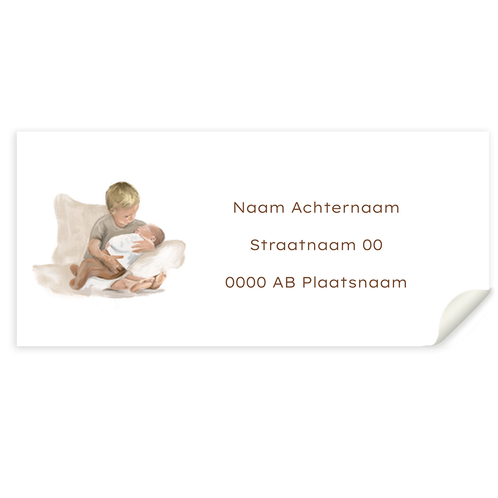 Adressticker voor geboorte met een illustratie van een broer met een baby. Je kunt de illustratie ook aanpassen voor andere gezinssamenstelling. Vraag gerust even hulp.
