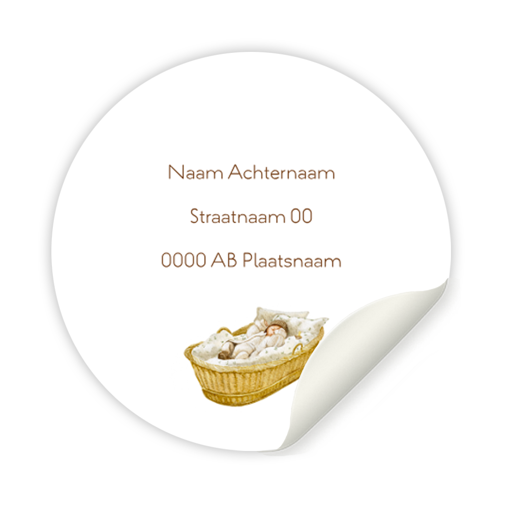 Ronde adressticker geboorte met baby in een mandje aquarel | 12 stuks