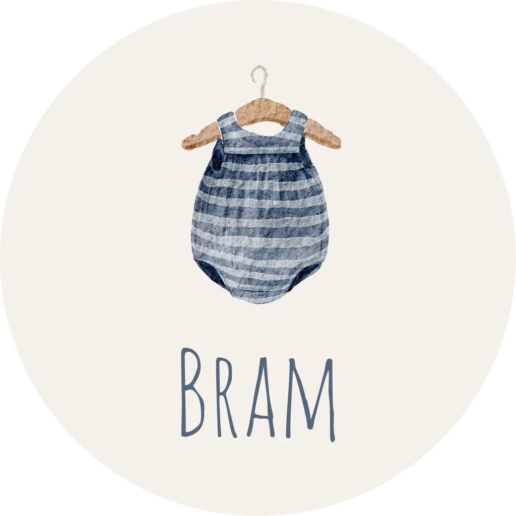 Sticker voor doopsuiker. Op de sticker staat een illustratie van een blauwe romper en de naam. Pas zelf de sticker voor een jongen aan met eigen tekst.