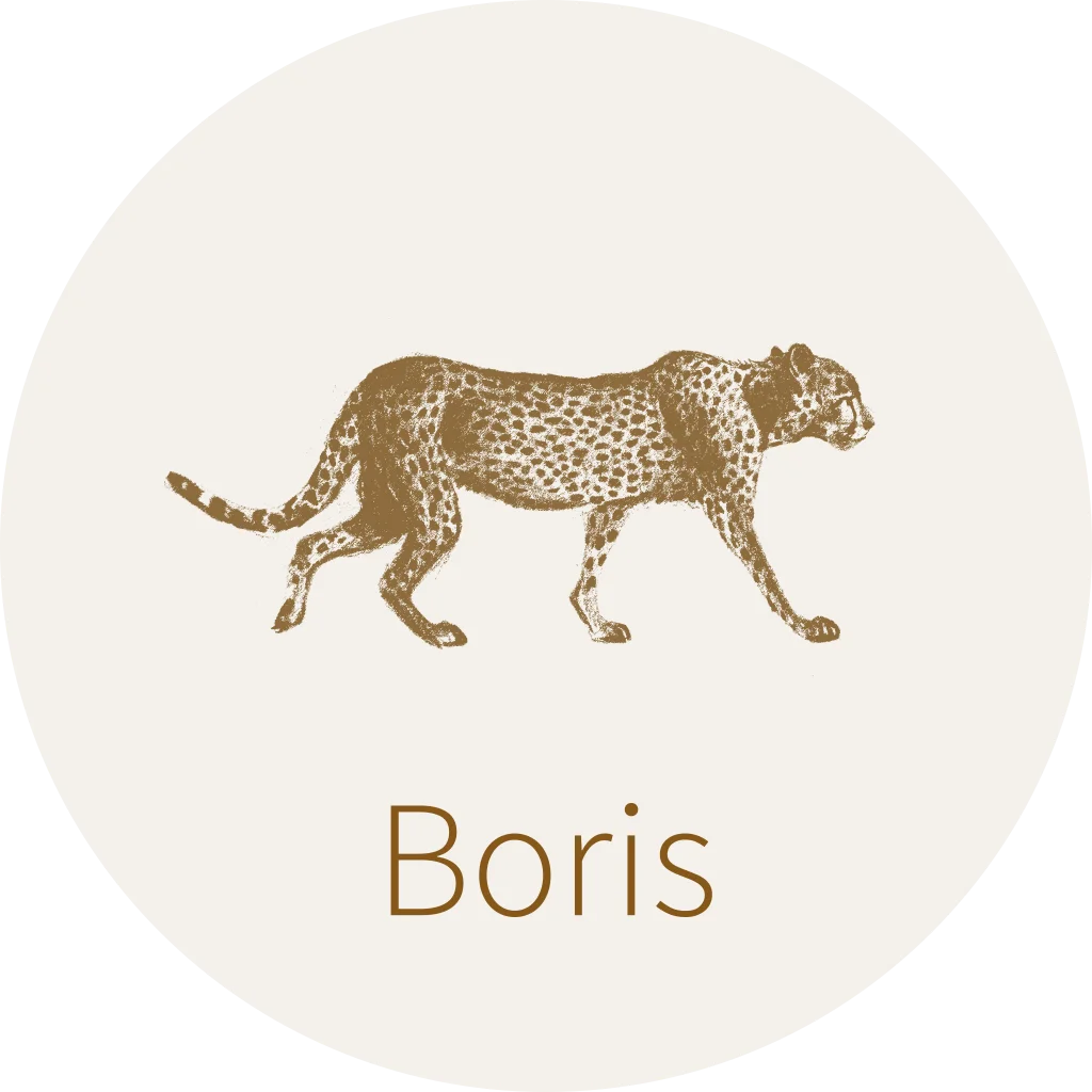 Sticker voor doopsuiker. Op de sticker staat een illustratie van een panter. Pas zelf de naam aan.