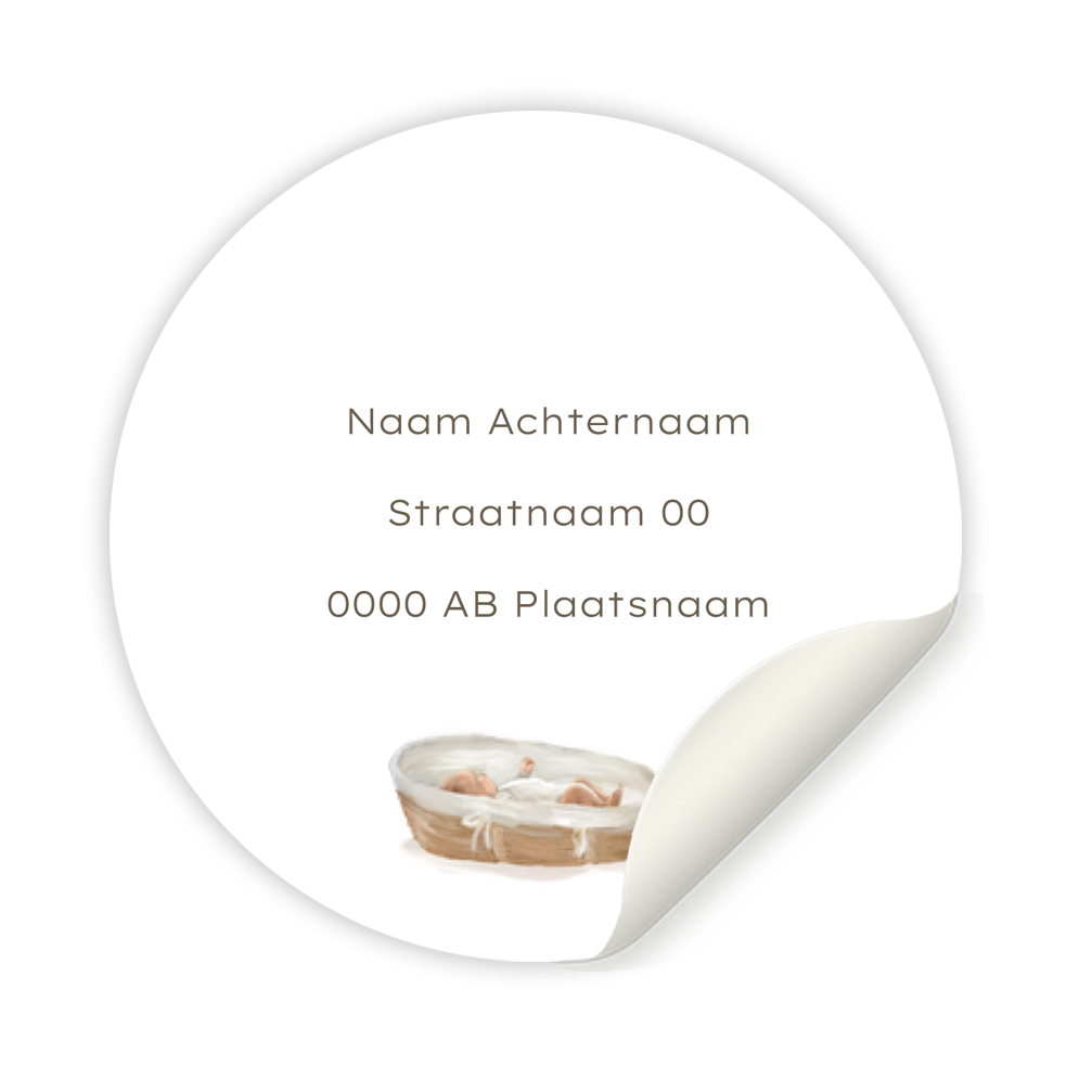 Ronde adressticker voor geboorte met illustratie baby in mandje