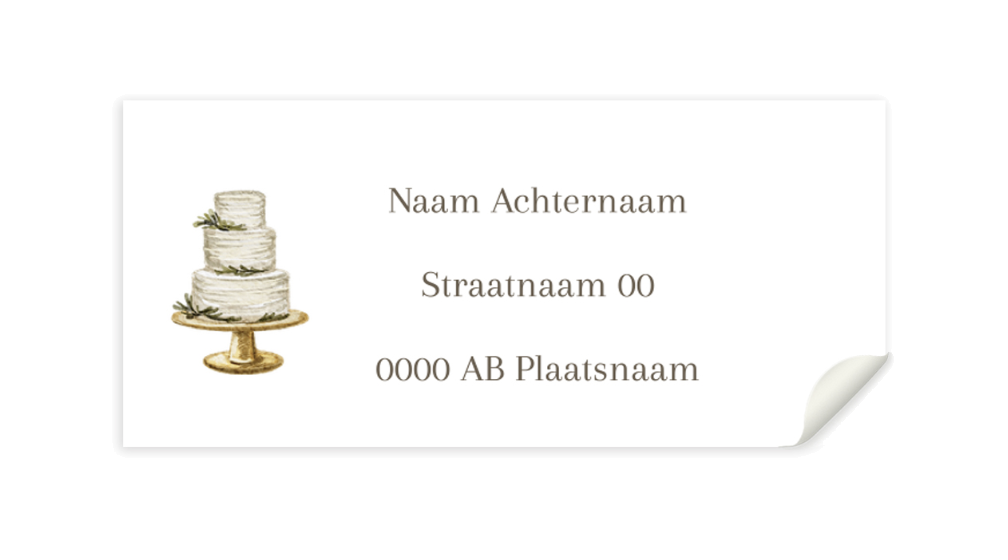 Adressticker voor trouwen met een illustratie van een bruidstaart. LET OP: Voer voordat je in de editor gaat het aantal in bij "opties selecteren". Formaat stickers 97x45mm.