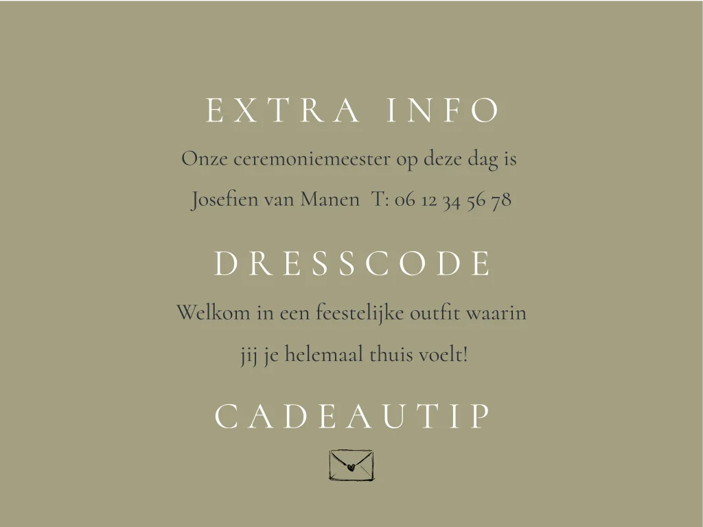 Groen label gasten trouwkaart met ruimte voor extra informatie rond jullie bruiloft. Dit label wordt gedrukt per 4 stuks en is 100x75mm.