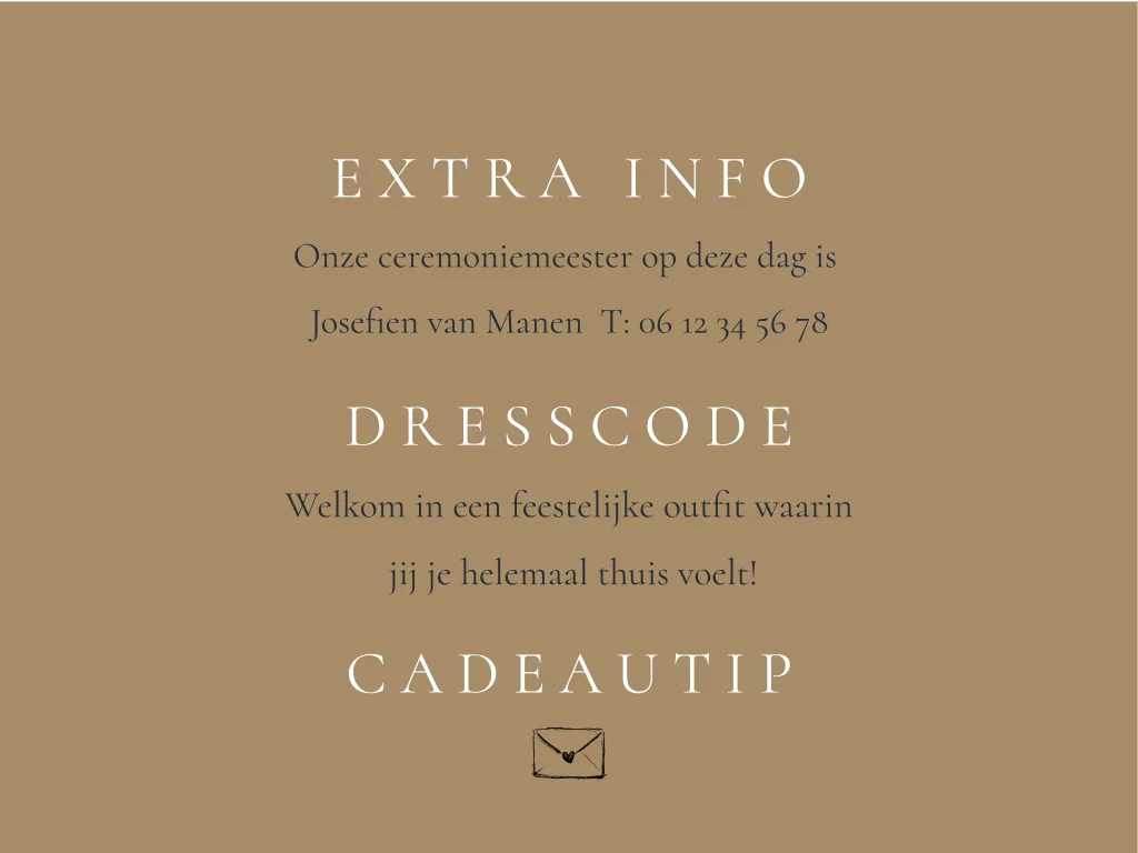 Okergeel label gasten trouwkaart met ruimte voor extra informatie rond jullie bruiloft. Dit label wordt gedrukt per 4 stuks en is 100x75mm.