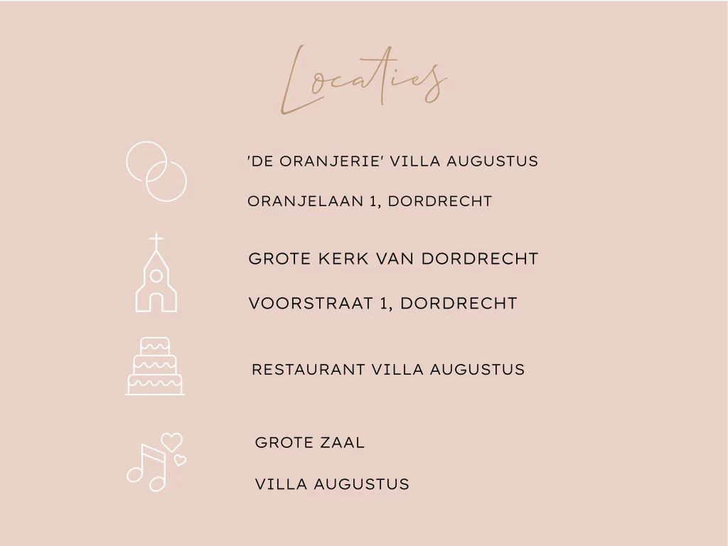 Roze label met locaties voor bij een trouwkaart. Deze labels worden gedrukt per 4 stuks en hebben het formaat van 100x75mm.