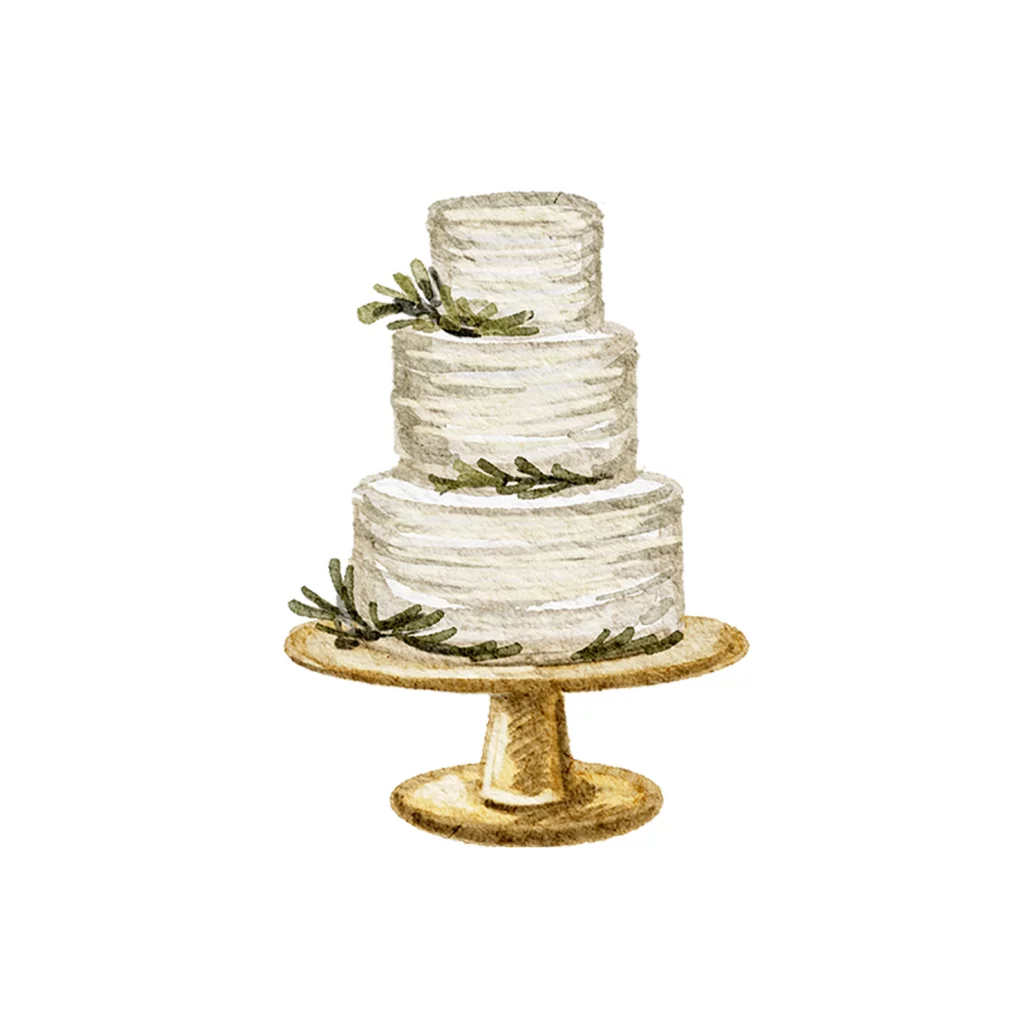 Sticker voor een trouwkaart met een illustratie van een bruidstaart.