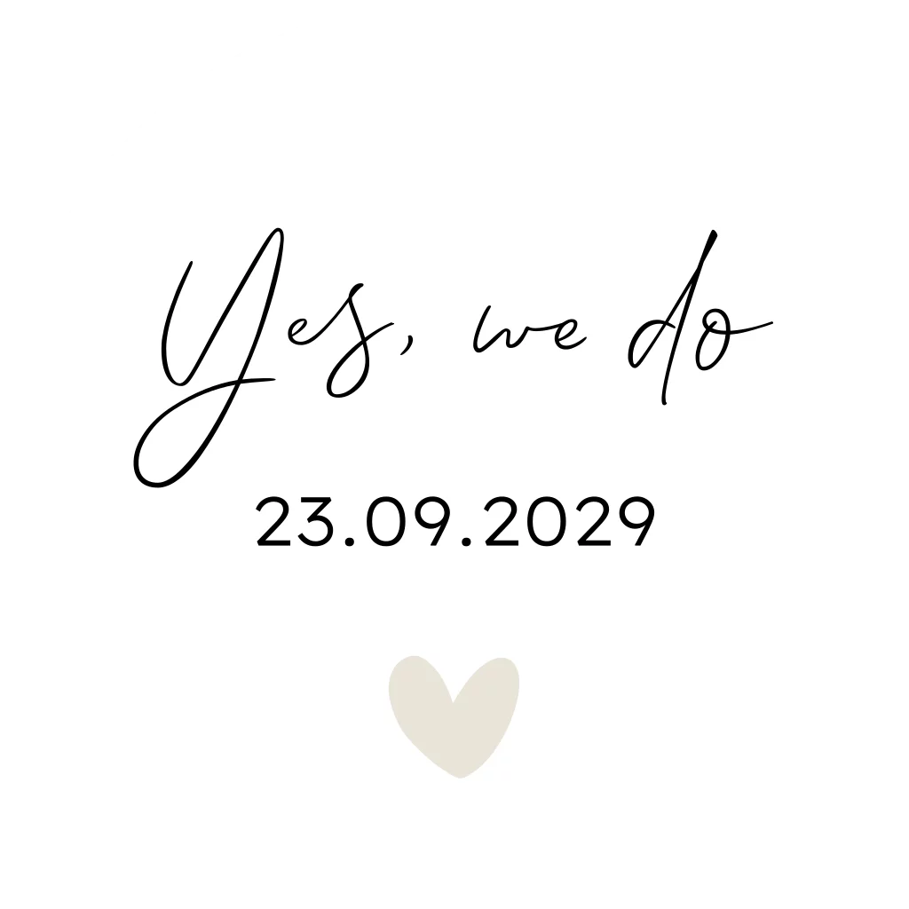 Sticker voor bij een trouwkaart met de tekst Yes, we do en de trouwdatum met een hartje.