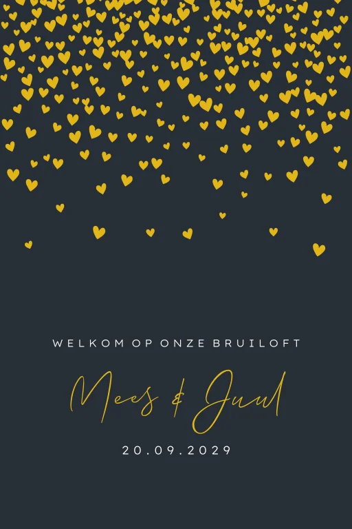 Donkerblauw bruiloftsbord met okergele hartjes en namen. Het welkomstbord is een weerbestendig bord gemaakt een hard, stevig en toch licht geschuimd PVC met een lichte structuur. Door de stralend witte toplaag komt de print optimaal tot zijn recht. Foliedruk is niet mogelijk op dit bord, in plaats hiervan zullen we een kleur drukken die hier op lijkt. Formaat 40x60 cm