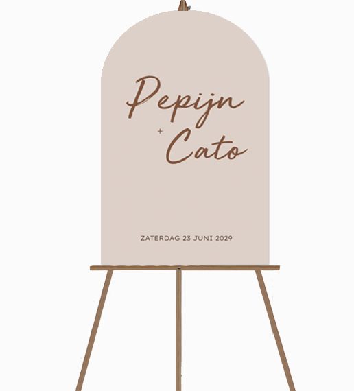 Een prachtig welkomstbord in een oudroze kleur. Dit bord is 46 x 73 en heeft een mooie boog. De namen staan er in donkerroze op. Je kunt dit bord zelf aanpassen met eigen teksten en kleuren. Dit bord zal zeker een eyecatcher zijn op jullie bruiloft!
