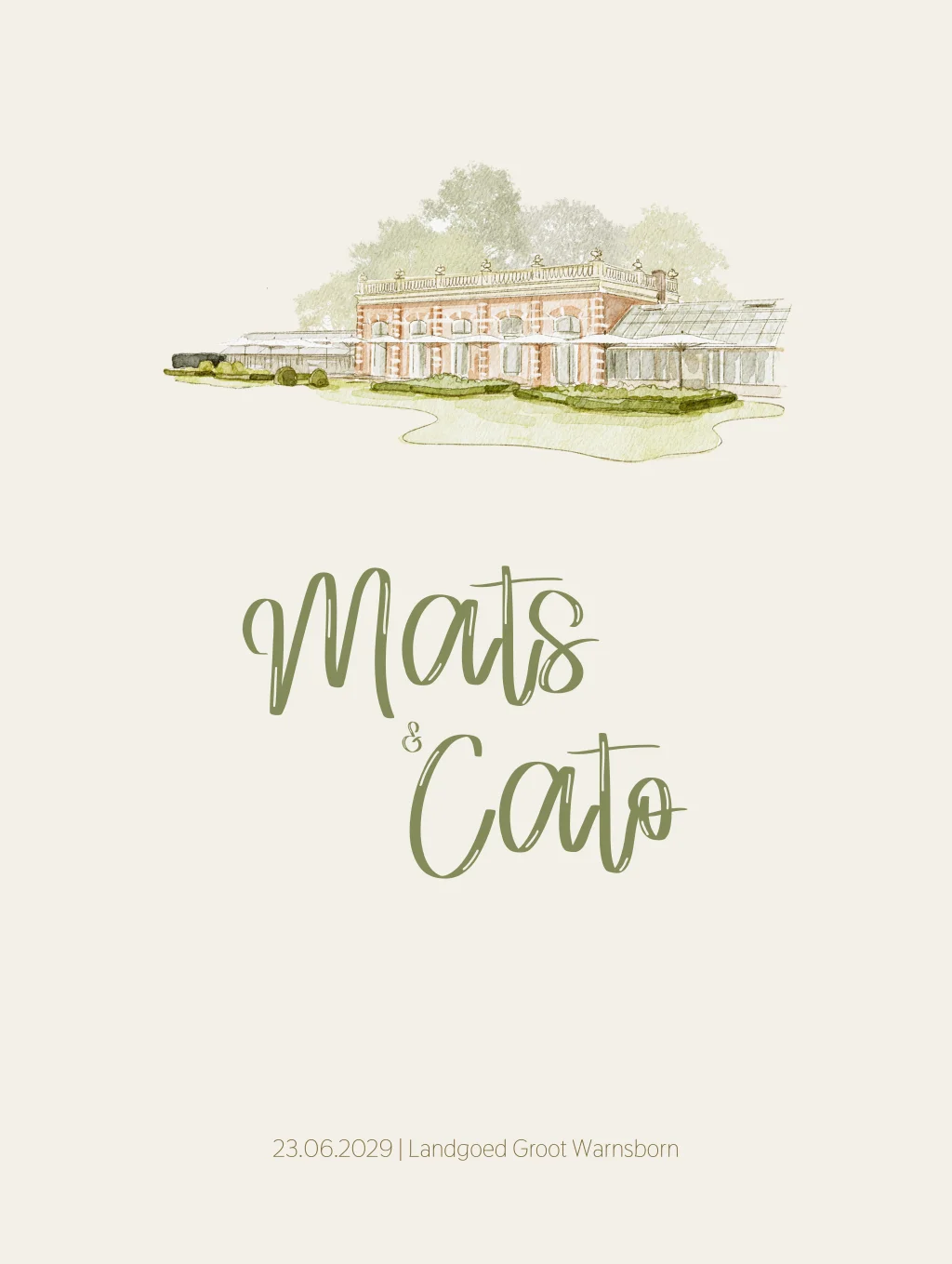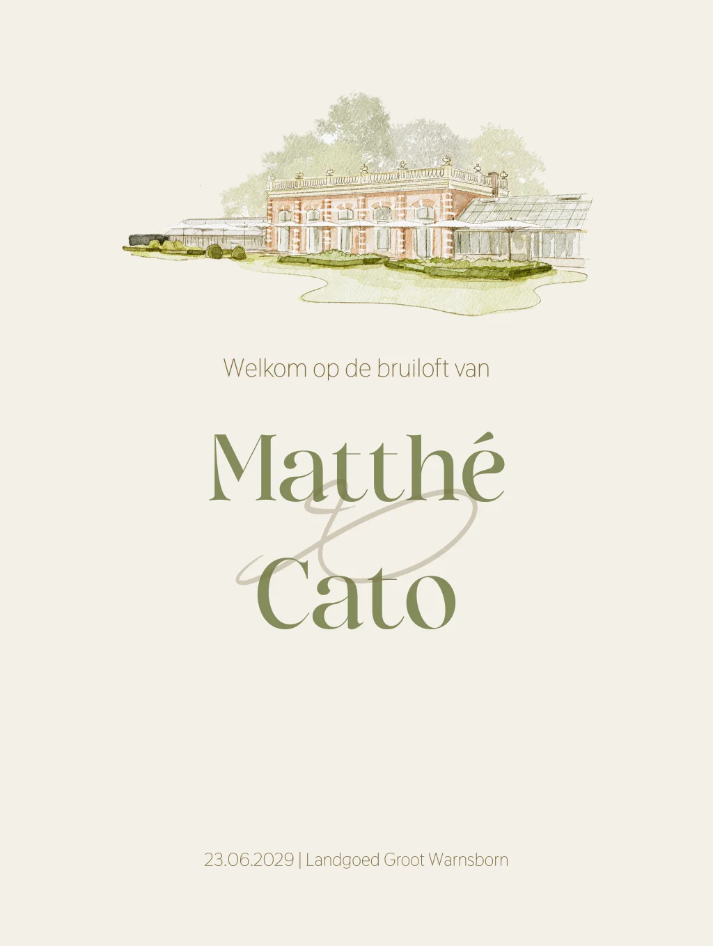 Welkomstbord bruiloft met getekende locatie van Groot Warnsborn in Arnhem. Zet dit bord aan het begin van de locatie om mensen welkom te heten. De teksten kan je zelf naar wens aanpassen.| Totaalprijs: 0 |