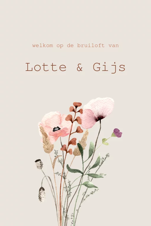 Welkomstbord voor een bruiloft met een illustratie van een mooi veldboeket. Dit bord past mooi bij de trouwkaarten uit deze serie.