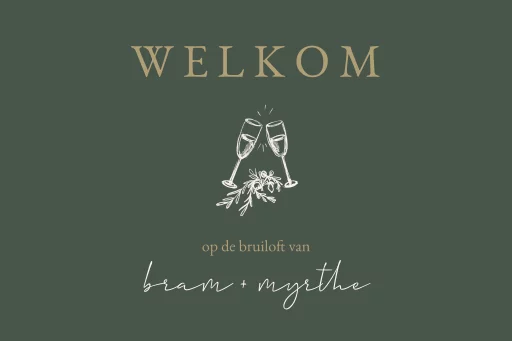 Welkomstbord in liggende rechthoek vorm met donkergroene achtergrond. Op het bord staat een illustratie van champagneglazen in pentekening. Je kunt dit bord zelf bewerken en aanpassen.