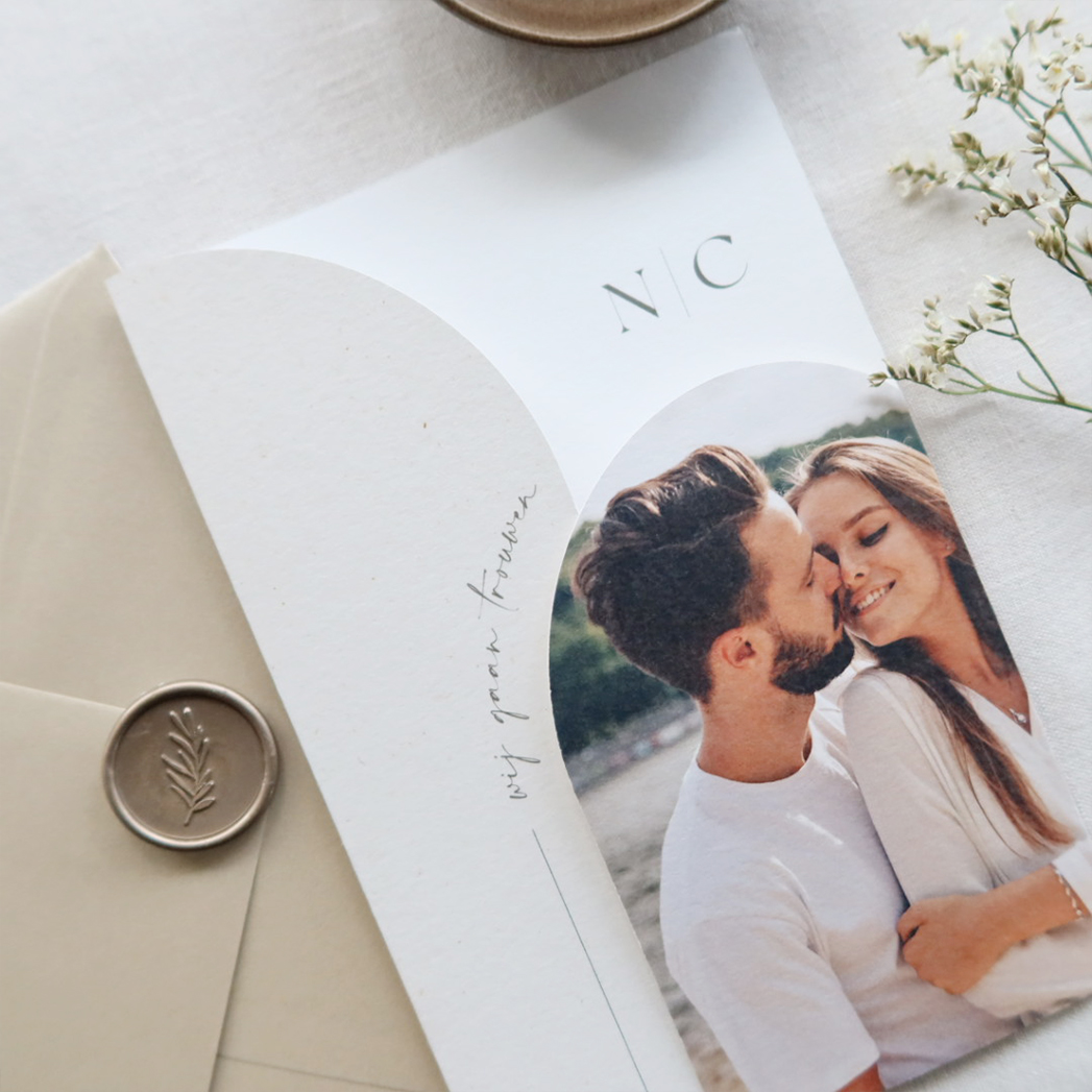 Een drieluik trouwkaart met mooie boogvormen. De linkerkant van de kaart is langer dan de rechterkant, die geeft de kaart een heel mooi effect. Aan de rechterkant is ruimte voor een eigen foto. Links staat een tekst in boogvorm 'wij gaan trouwen'. We kunnen de tekst naar wens aanpassen. Vervang de foto door jullie eigen foto en maak de kaart verder af.