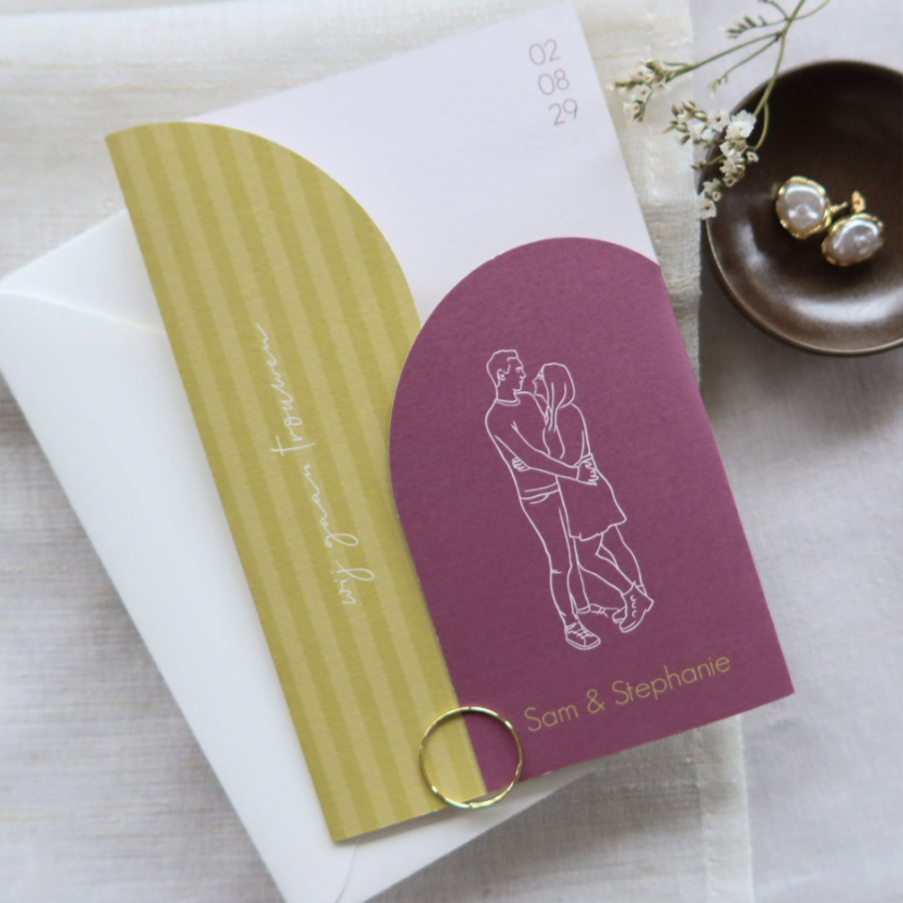 Een trendy trouwkaart in groen en aubergine. De achtergrond heeft een groen streeppatroon en het boogvorm luikje heeft een aubergine kleur. Daarop staat een lijntekening van een stel. Wij kunnen jullie ook natekenen aan de hand van een goede foto. Vraag ons gerust om hulp. Aan de binnenzijde van de kaart vind je een dagplanning met getekende icoontjes. Wil je liever geen tekening op je kaart dan kan je deze gewoon verwijderen in de editor.