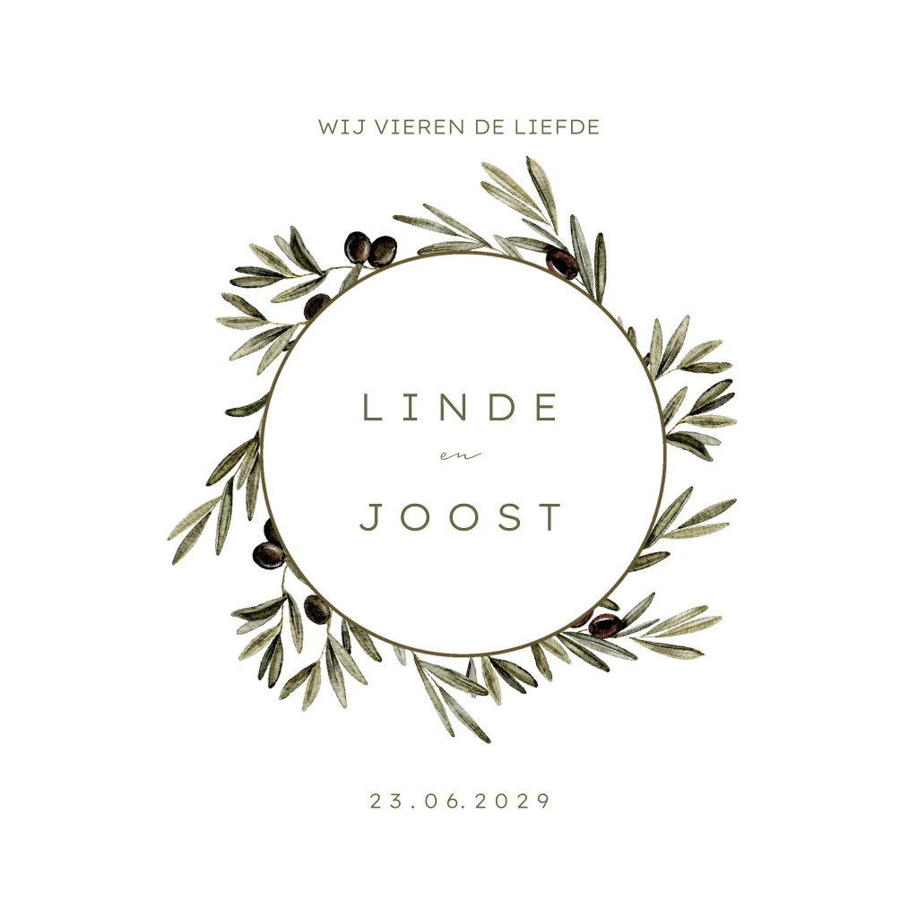 Enkele vierkante trouwkaart met een ronde krans van olijftakken. Deze kaart heeft alleen een bedrukte voorkant en plak je in een pocketfold mapje. Bij deze uitnodiging horen losse kaartjes die je kunt toevoegen aan de pocketfolds. Hulp nodig? Laat even weten!