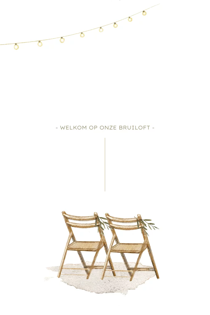 Nodig alle gasten voor jullie bruiloft uit met deze unieke uitnodiging. Het is een stijlvolle kaart met een mooie waterverf illustratie van klapstoelen. Gaan jullie je bruiloft vieren met een vintage buiten thema, dan past deze kaart er helemaal bij.