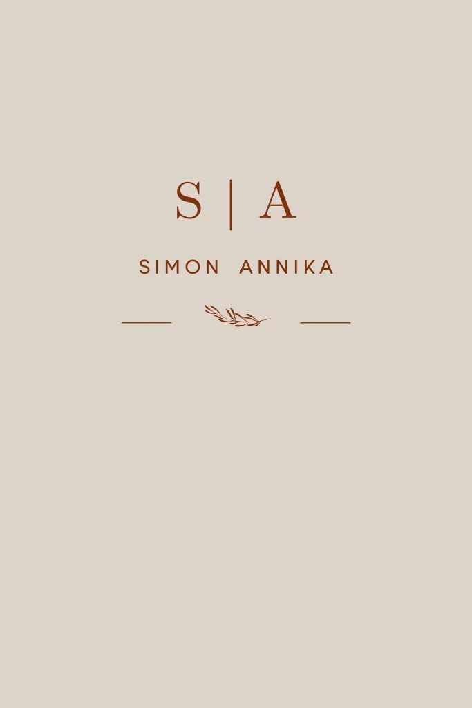 Rechthoekige staande trouwkaart met een taupe achtergrond kleur. Daarop staan initialen in een roestbruine kleur en een takje.