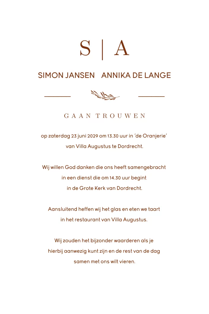 Trouwkaart met initialen in roestbruin en een getekend takje