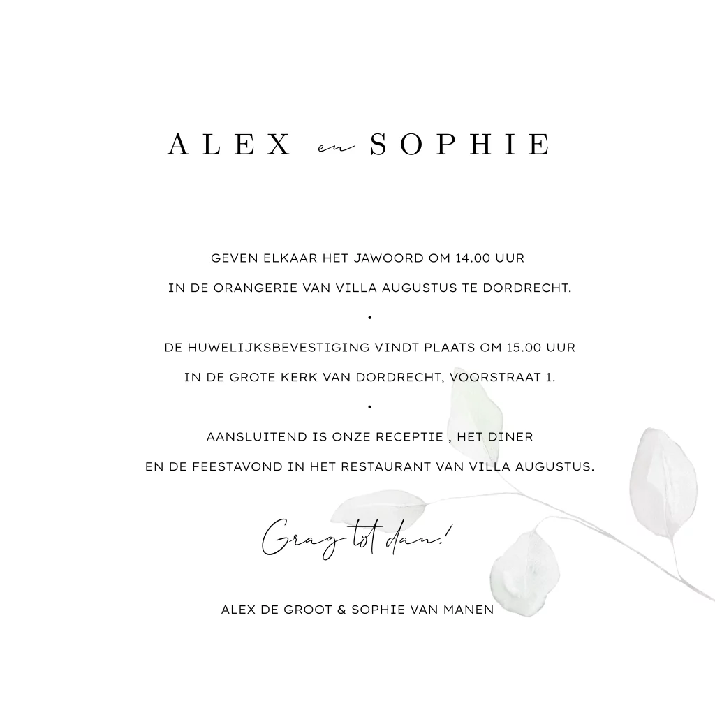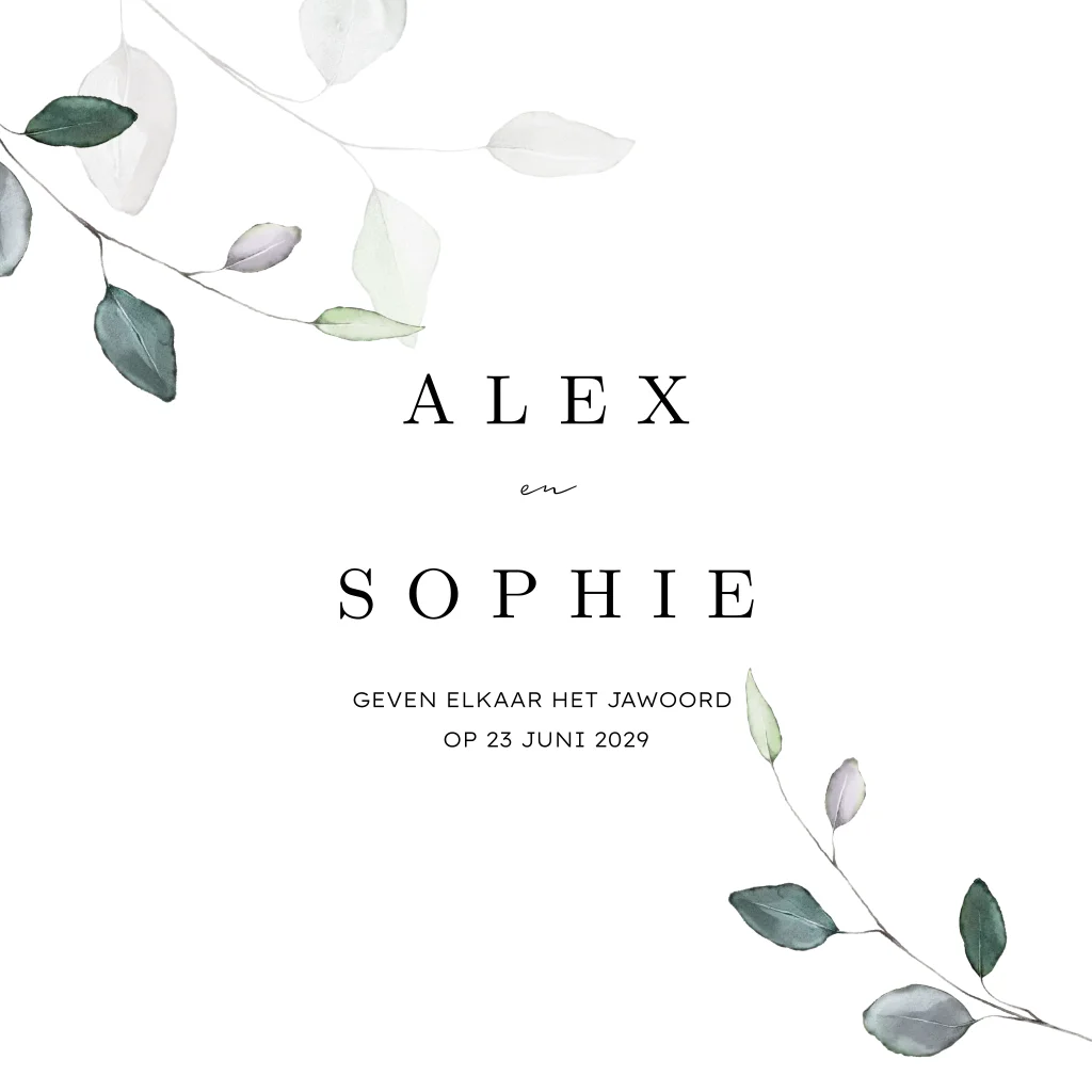 Klassieke vierkante trouwkaart met groene waterverf takjes. De illustraties staan los op de kaart, zodat je zelf kunt schuiven. Maak deze uitnodiging voor jullie huwelijk zelf helemaal af.
