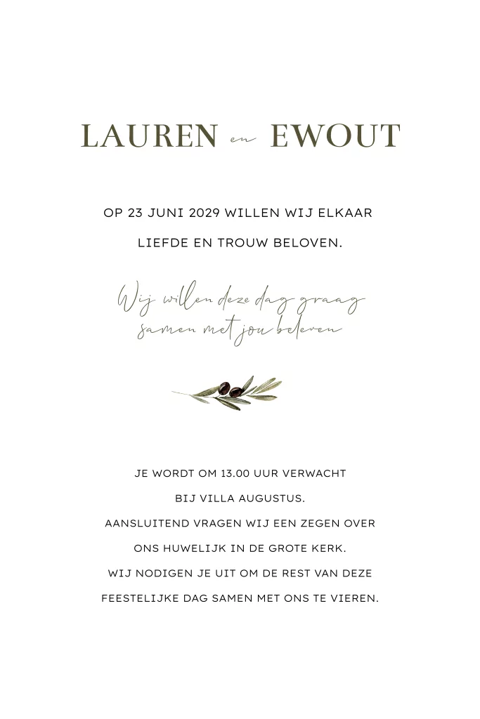 Prachtige trouwkaart met een getekende olijftak. Deze klassieke uitnodiging voor jullie huwelijk kan je zelf helemaal naar wens aanpassen.