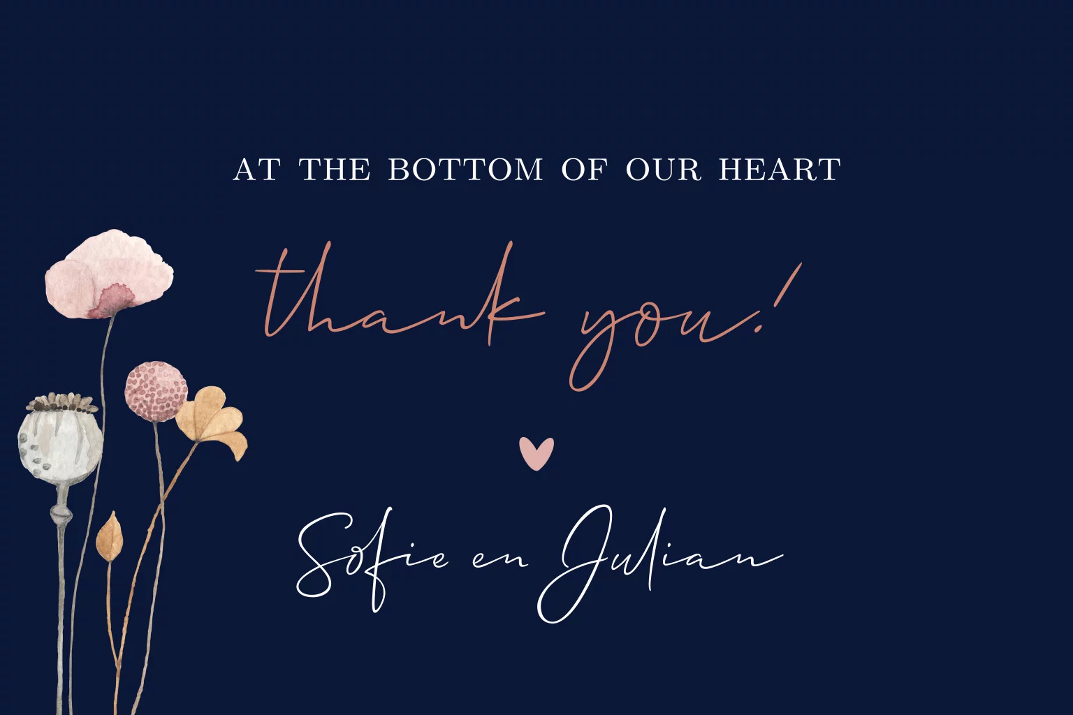 Laat je bedankkaartjes drukken in stijl van jullie trouwkaarten om het hele plaatje compleet te maken. De ronde hoeken geven deze serie een zachte uitstraling. Deze bedankkaart is donkerblauw met droogbloemen.