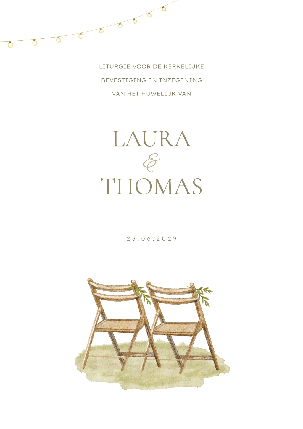 Maak al het drukwerk van jullie bruiloft in één stijl. Kiezen jullie voor een kerkdienst dan is deze liturgie heel goed te gebruiken. Met een liturgieboekje kunnen jullie gasten de volgorde van de dienst volgen en weten ze precies de onderdelen van jullie trouwdienst. Deze liturgie is gepersonaliseerd en in stijl met de trouwkaarten in deze serie. De voorkant bevat illustraties van klapstoelen in het gras. Het boekje bevat 12 pagina's die je zelf kunt indelen. De teksten aan de binnenkant zijn voorbeeld teksten, je kunt deze zelf bewerken en aanpassen naar jullie eigen dienst. Bestel een proefdruk zodat je goed kunt controleren of alle teksten goed leesbaar zijn en de volgorde klopt.