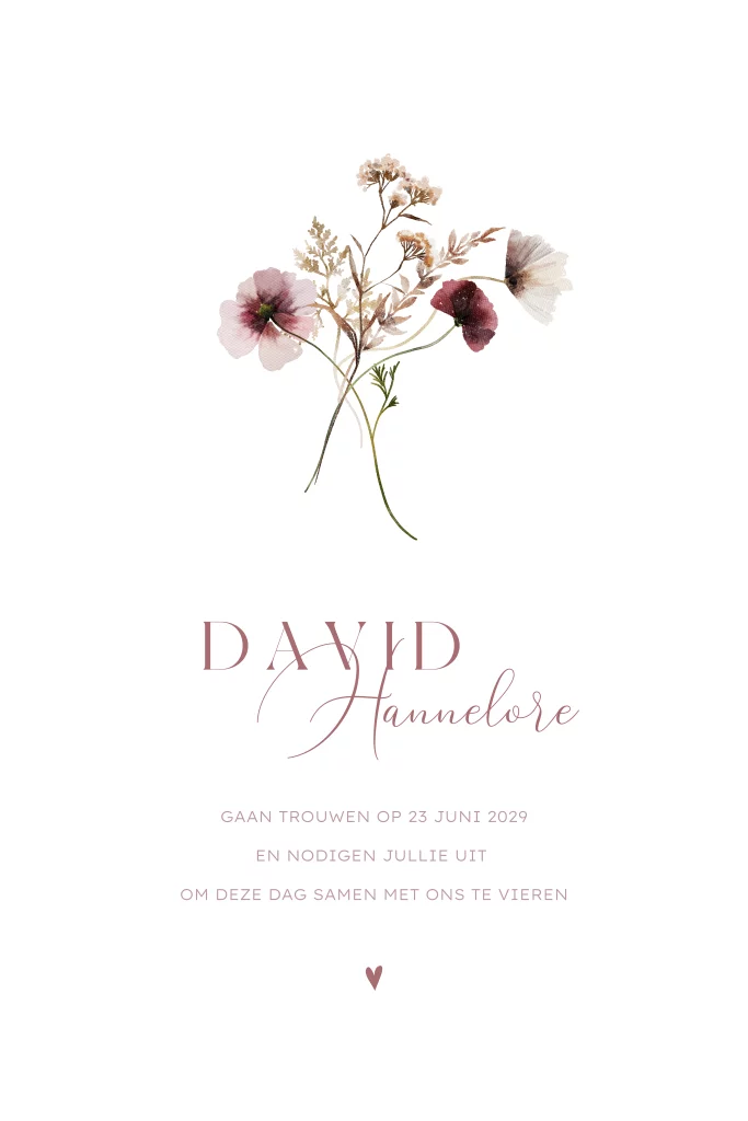 Deze prachtige bloemen trouwkaart met ronde hoeken heeft een stijlvolle illustratie van een boeket in zachte roze en paarse tinten. Perfect om jullie bijzondere dag aan te kondigen met een romantische, kleurrijke uitstraling. Maak jullie trouwuitnodiging persoonlijk en uniek met deze stijlvolle kaart. De roze lakzegel op de foto is maatwerk, en kunnen we speciaal voor jullie maken.| Totaalprijs: 0 |