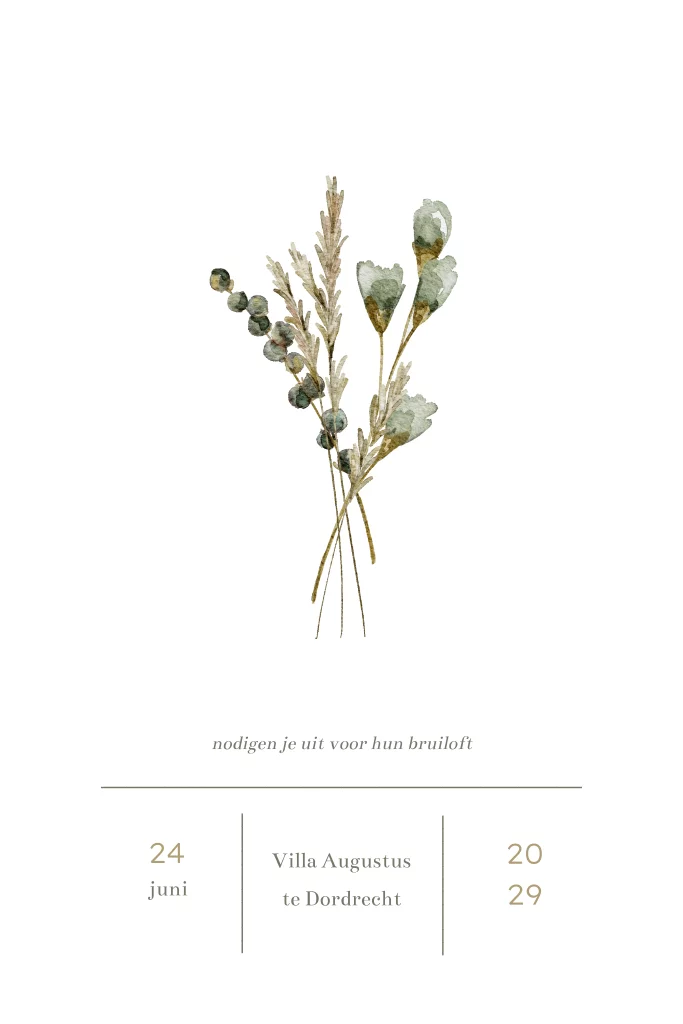 Trouwkaart met getekende bloemen en takjes in waterverf. Deze botanische kaart heeft bloemen in een blauwgroene kleur en daarbij losse takjes. Jullie namen worden gedrukt in goudfolie. Alle illustraties staan los op het kaartje en kan je zelf naar wens aanpassen.