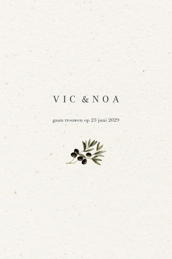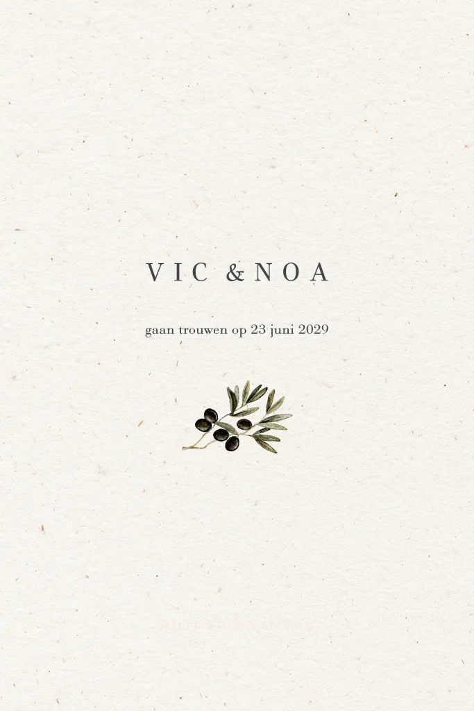 Eenvoudige trouwkaart met een beige papierlook achtergrond en een illustratie van olijftakjes. Door de eenvoud wordt deze kaart ook juist heel stijlvol.