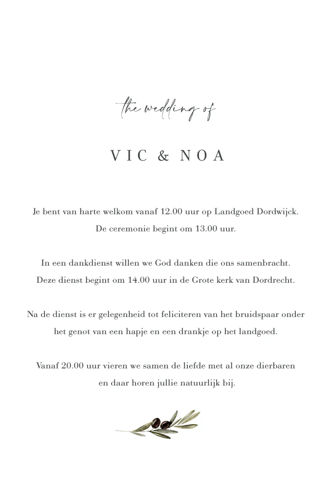 Eenvoudige trouwkaart met een beige papierlook achtergrond en een illustratie van olijftakjes. Door de eenvoud wordt deze kaart ook juist heel stijlvol.| Totaalprijs: 0 |