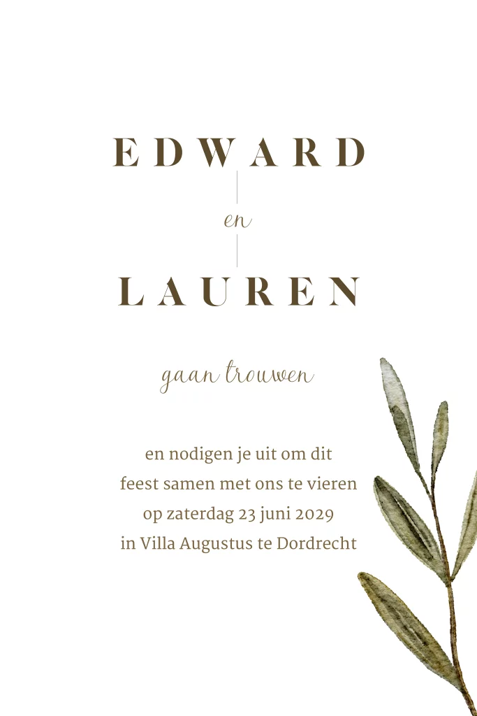 Eenvoudige trouwkaart met een groen takje van waterverf. De illustratie en teksten op dit trouwkaartje kan je zelf aanpassen.