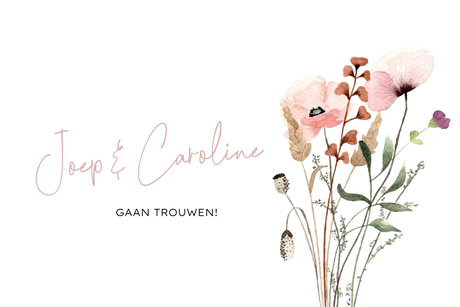Clean en minimalistisch ontwerp voor jullie bruiloft met handgeschilderde plukbloemen. Less is more! Je past jullie namen en de tekst eenvoudig aan naar je eigen wensen.