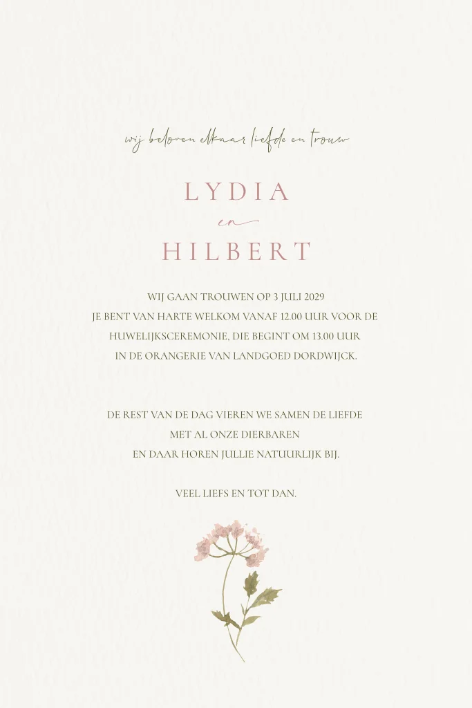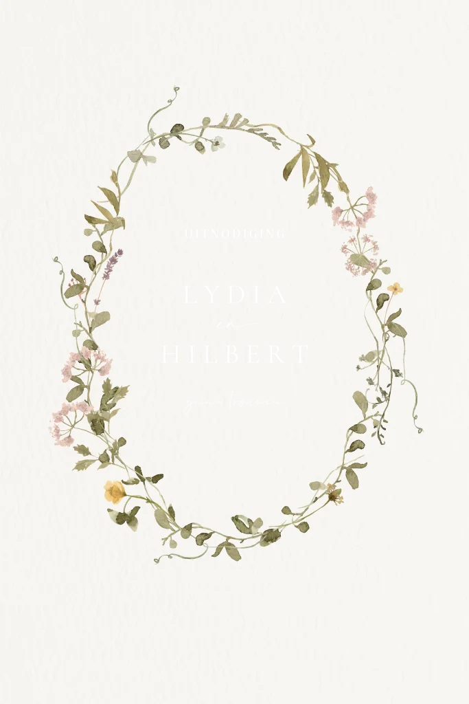 Trouwkaart met een bloemen krans in roze en groene tinten. Deze getekende uitnodiging voor jullie bruiloft heeft een beige papier achtergrond wat een mooie combinatie is met de aquarel bloemen. De namen worden gedrukt in glanzend goudfolie.