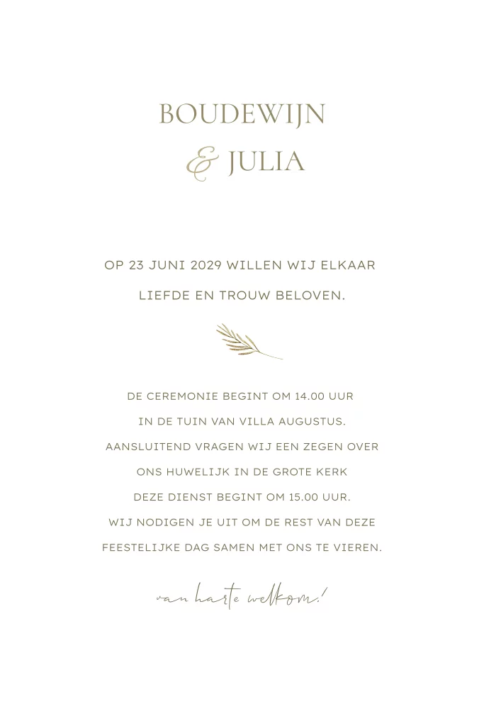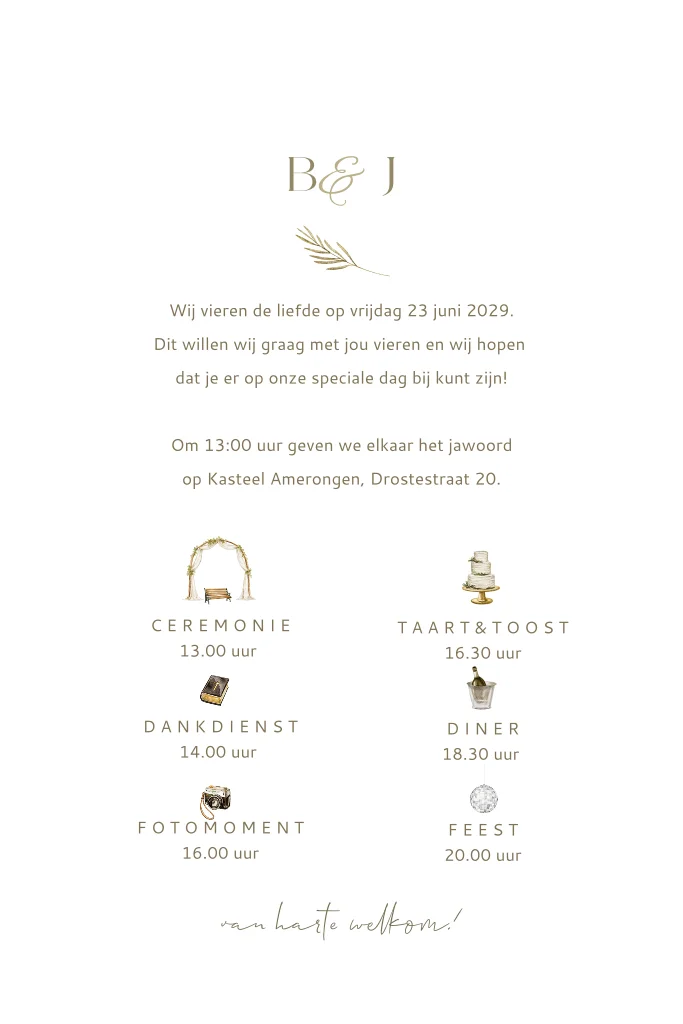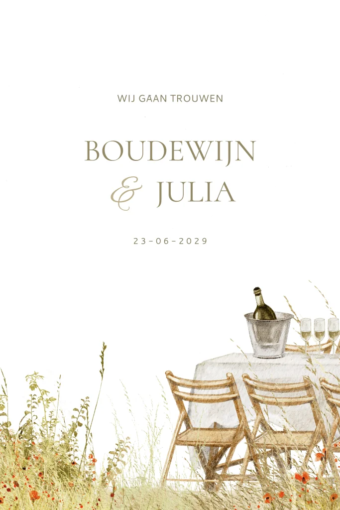 Gaan jullie een bruiloft buiten vieren? Dan is deze getekende trouwkaart een mooie optie voor jullie. De kaart heeft een mooie sfeer door de aquarel illustraties van veldbloemen. Tussen het gras staat een tafel met klapstoelen en champagne. Deze trouwkaart met unieke illustraties kan je zelf verder aanpassen en bewerken.
