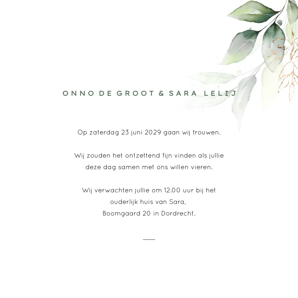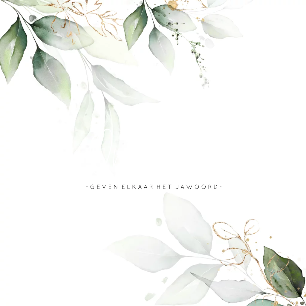 Vierkante uitnodiging voor jullie bruiloft met waterverf bloemen. De namen op deze trouwkaart zijn gedrukt in goudfolie, evenals de spetters die op het kaartje staan. Ontwerp zelf je kaart in onze editor.