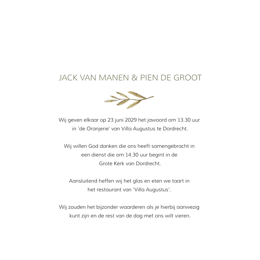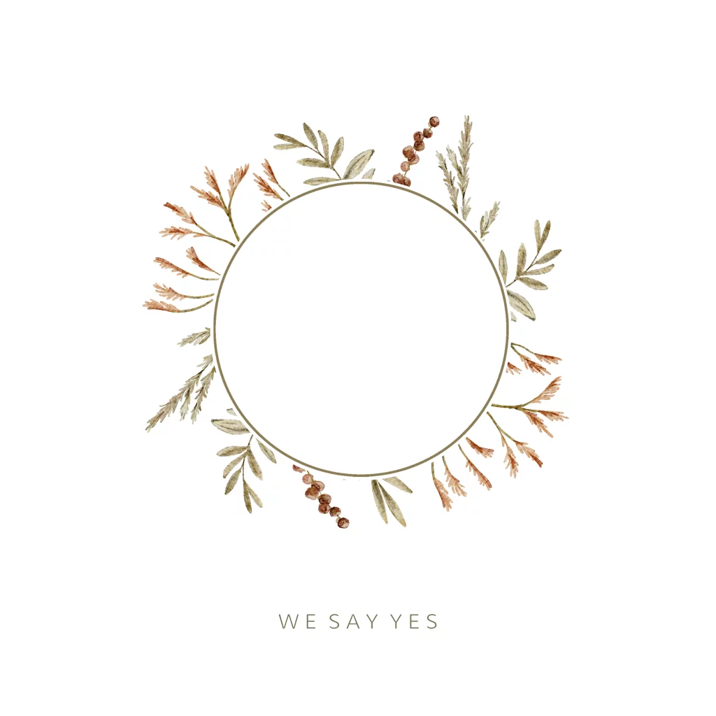 Trouwkaart met een krans van groene en roestbruine takjes. De takjes zijn handgetekend en de initialen staan in de krans. Deze worden gedrukt in goudfolie, maar je kunt zelf een andere folie kleur kiezen.
