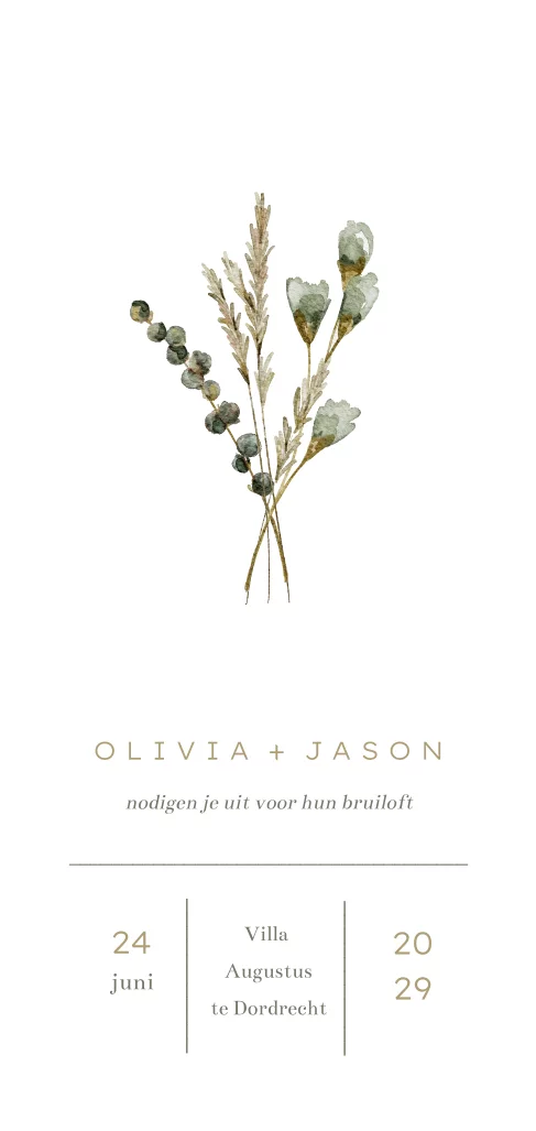 Enkele staande trouwkaart met waterverf takjes in groene tinten. De takjes kan je zelf aanpassen. Op de achterkant komen deze illustraties ook terug.