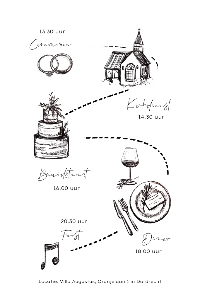 Dagprogramma met pentekeningen in de vorm van een routekaart. Op de kaart staat een stippellijn met de programma onderdelen aangegeven met pictogrammen. Dit kaartje kan je zelf helemaal aanpassen.