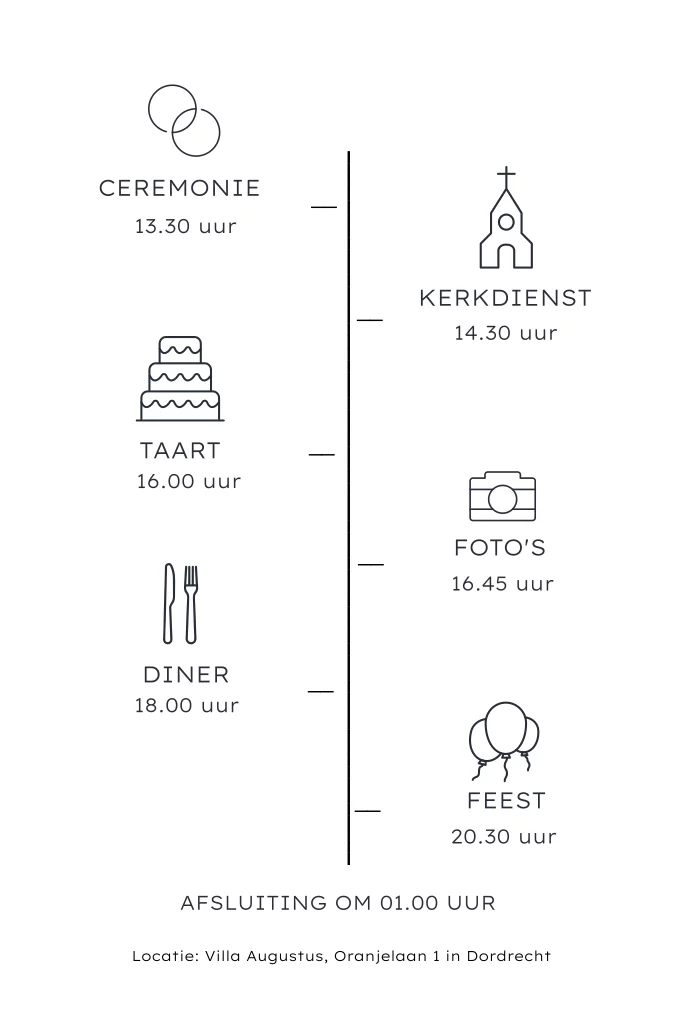 Programma kaartjes voor een bruiloft met icoontjes. De kleuren van de illustraties kan je naar wens aanpassen zodat het kaartje mooi bij de trouwkaart past. Heb je hulp nodig, laat het gerust weten!