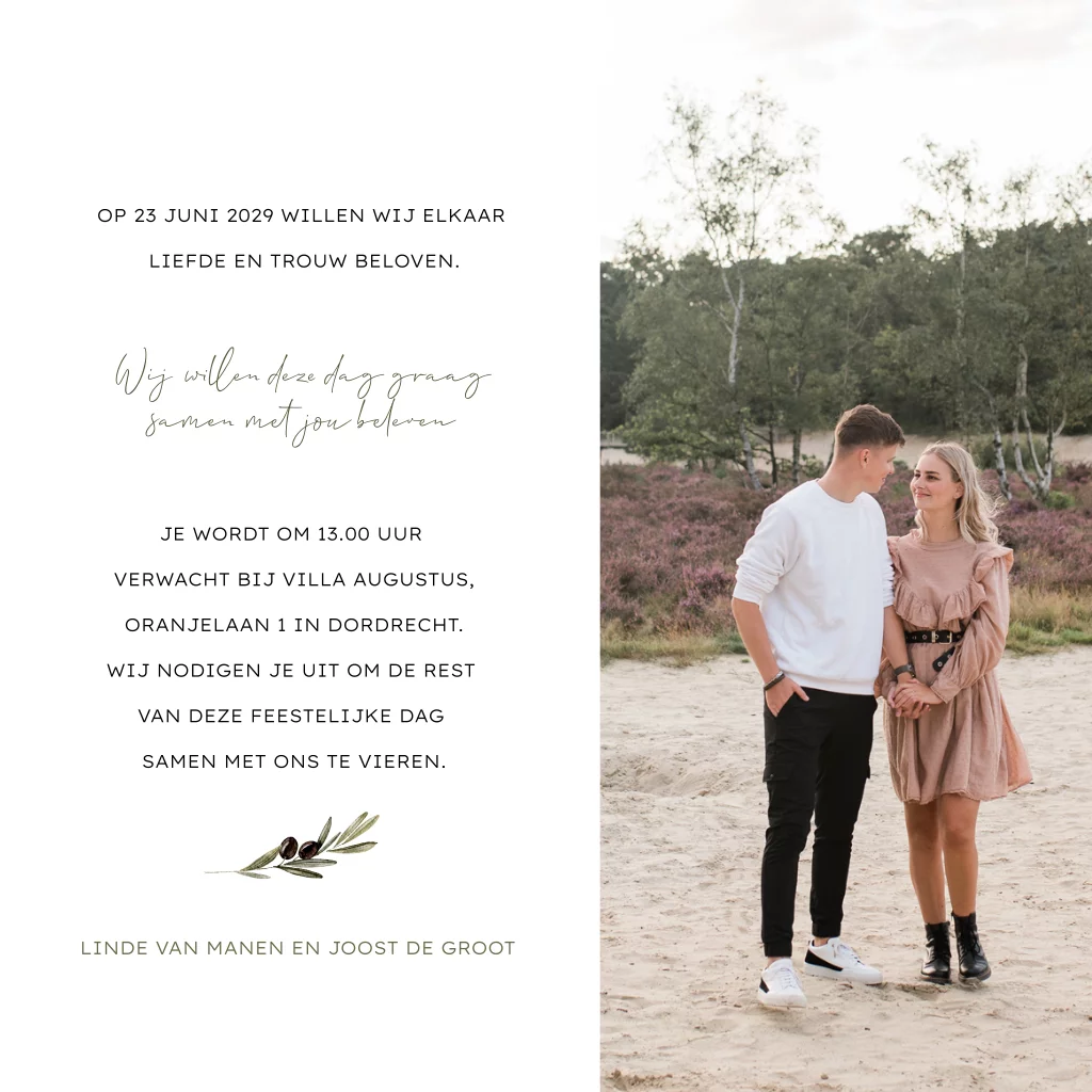 Uitnodiging voor een huwelijk met eigen foto en olijftak