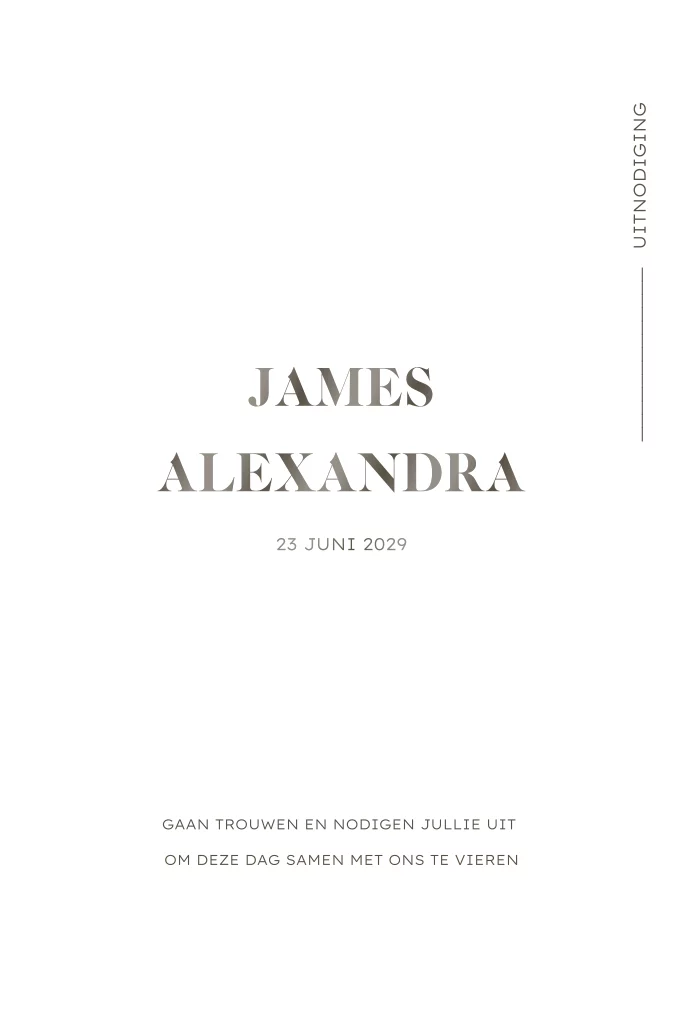 Prachtige minimalistische en stijlvolle trouwkaart. Een mooie witte uitnodiging met de namen in een mooie hoogglans gedrukt. De letters liggen op de kaart en geven deze trouwkaart een extra klassieke uitstraling. Bij deze kaart hoort ook een dagprogramma kaartje met extra informatie voor de gasten.