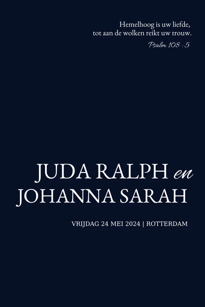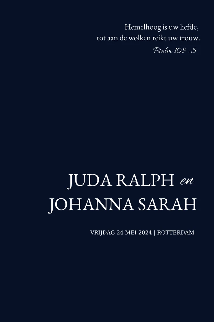 Wij maken prachtige, stijlvolle en chique trouwkaarten. Onze collectie trouwkaarten is een echte aanrader voor bruidsparen die op zoek zijn naar iets bijzonders. Wij gebruiken alleen de beste materialen en afwerkingen, zodat u zeker bent van een stijlvolle trouwkaart. Deze donkerblauwe trouwkaart heeft ronde hoeken en witte teksten. Een kaart die een mooie chique uitstraling heeft door een mooie typografie. Je kunt onze trouwkaarten zelf eenvoudig bewerken in de handige editor.Van deze kaart hebben we meerdere kaarten, voor een complete trouwhuisstijl.