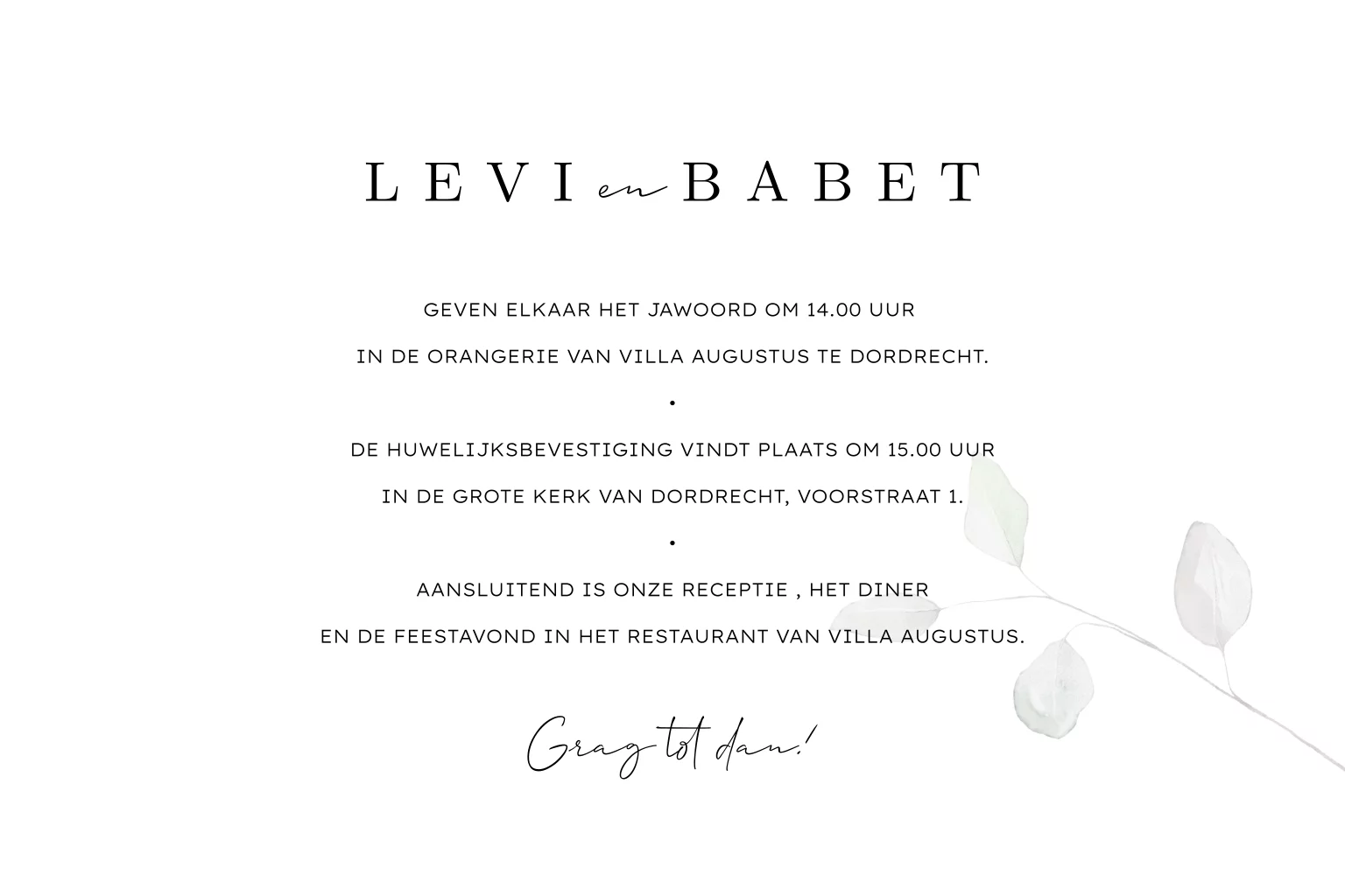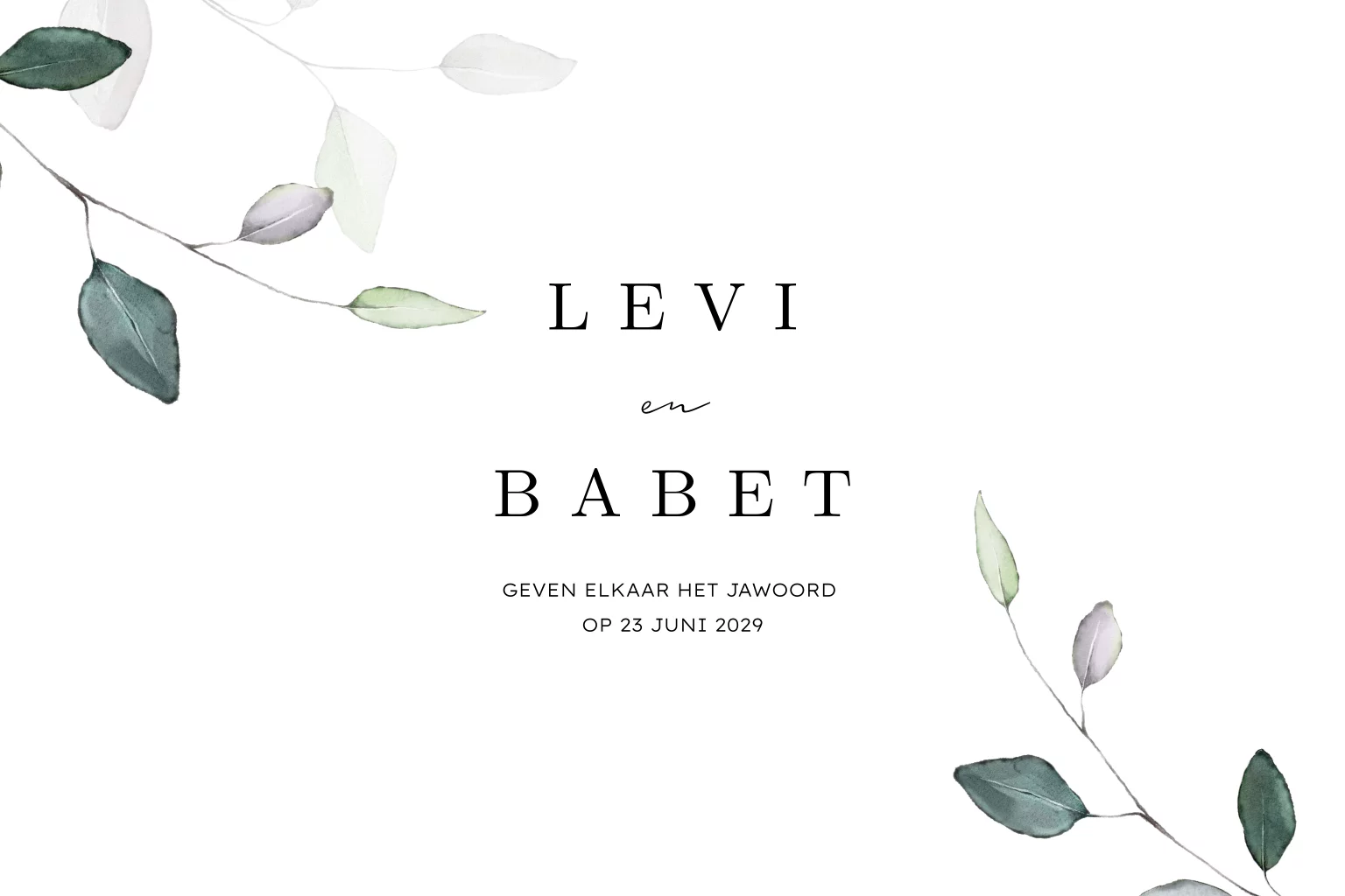 Liggende trouwkaart met in de hoeken takjes van waterverf. De getekende illustraties geven dit kaartje een klassieke uitstraling. De takjes staan los op de kaart en kan je zelf eventueel verplaatsen.