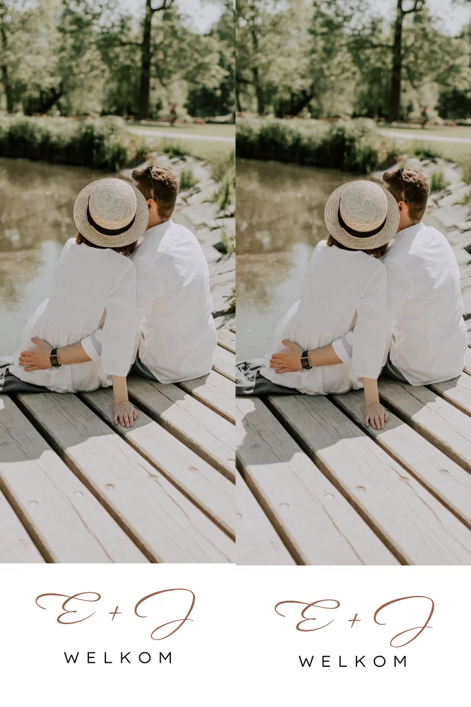Kaart met 2 fotolabels die je zelf nog thuis moet snijden. Dan krijg je een mooi smal label die je kunt toevoegen aan je trouwkaart voor een extra persoonlijk element.