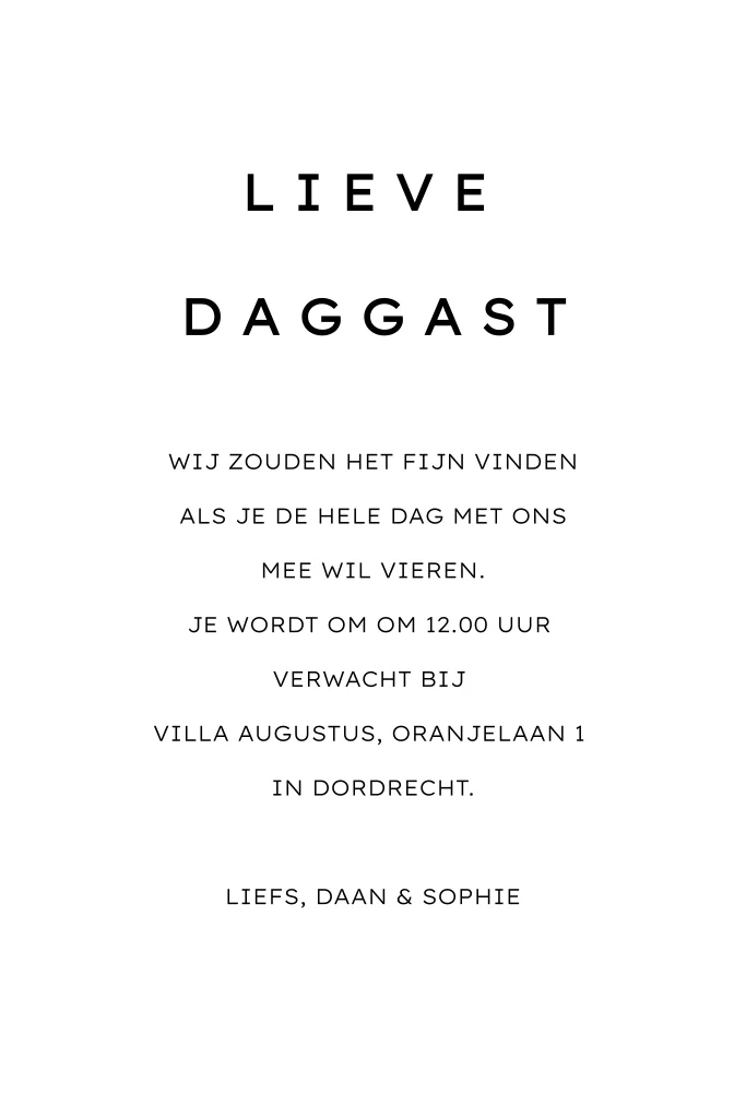 Willen jullie je gasten laten weten dat zij de hele dag welkom zijn op jullie bruiloft, gebruik dan dit label. Je kunt het kaartje opmaken in dezelfde stijl als de trouwkaart voor een mooi geheel. Bestel het kaartje op formaat 7x10 cm.